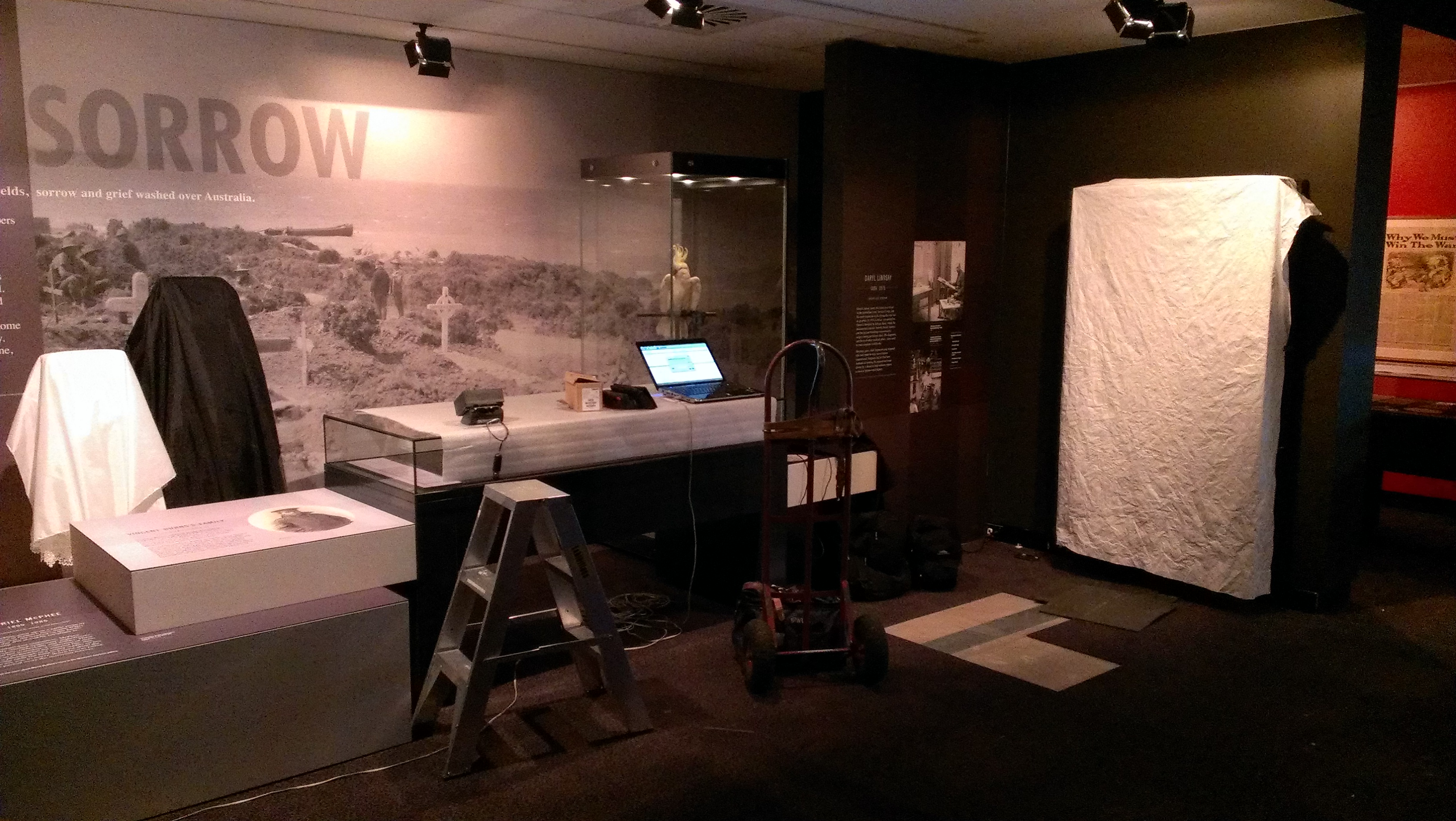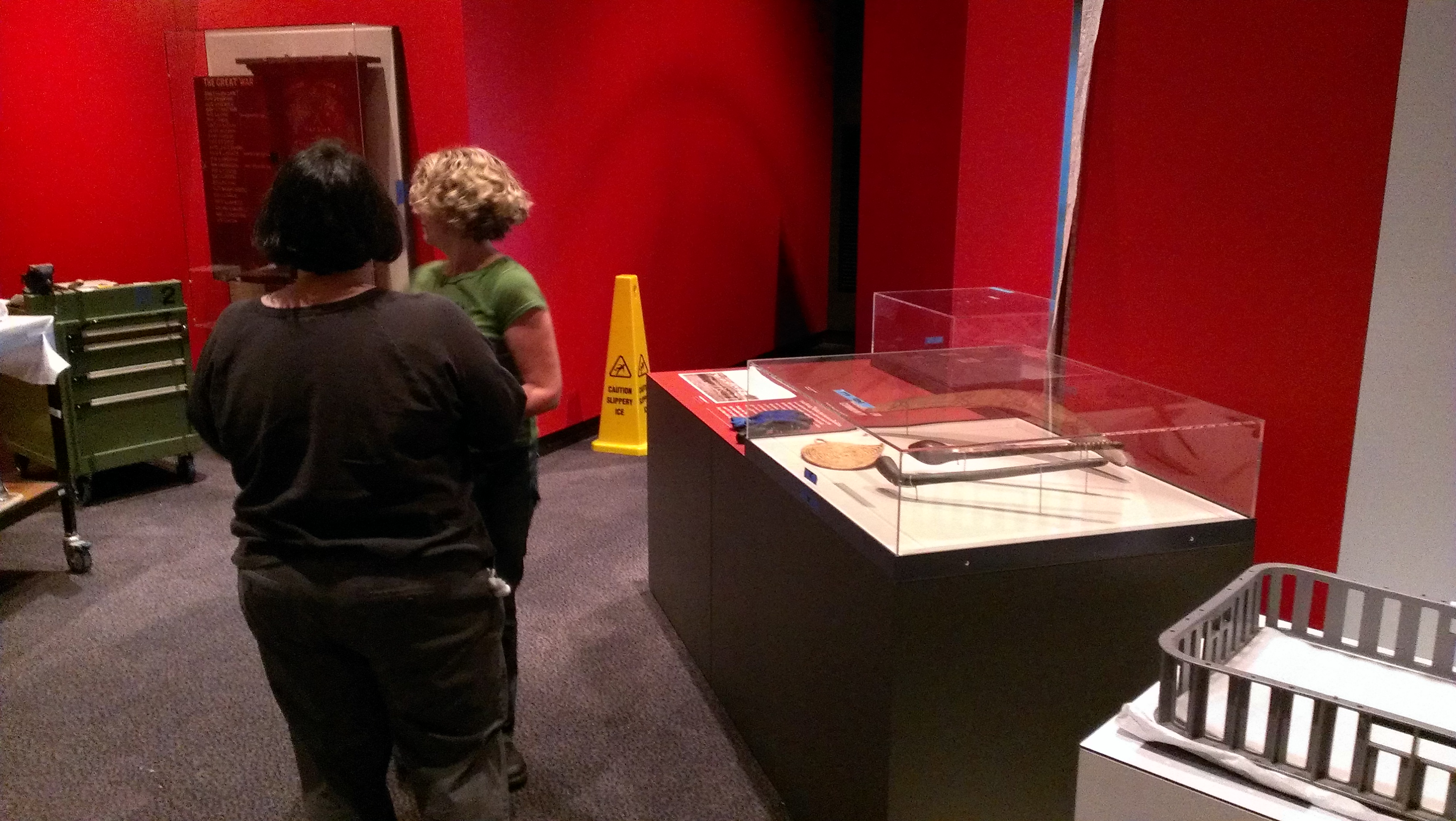 After the objects and text are complete then the lighting specialists take over. Even in a relatively small space like the National Museum’s studio gallery it takes two full days to adjust the lighting to mediate between highlighting the objects and to not exposing the artefacts to excessive light that will reduce their lifespan.
