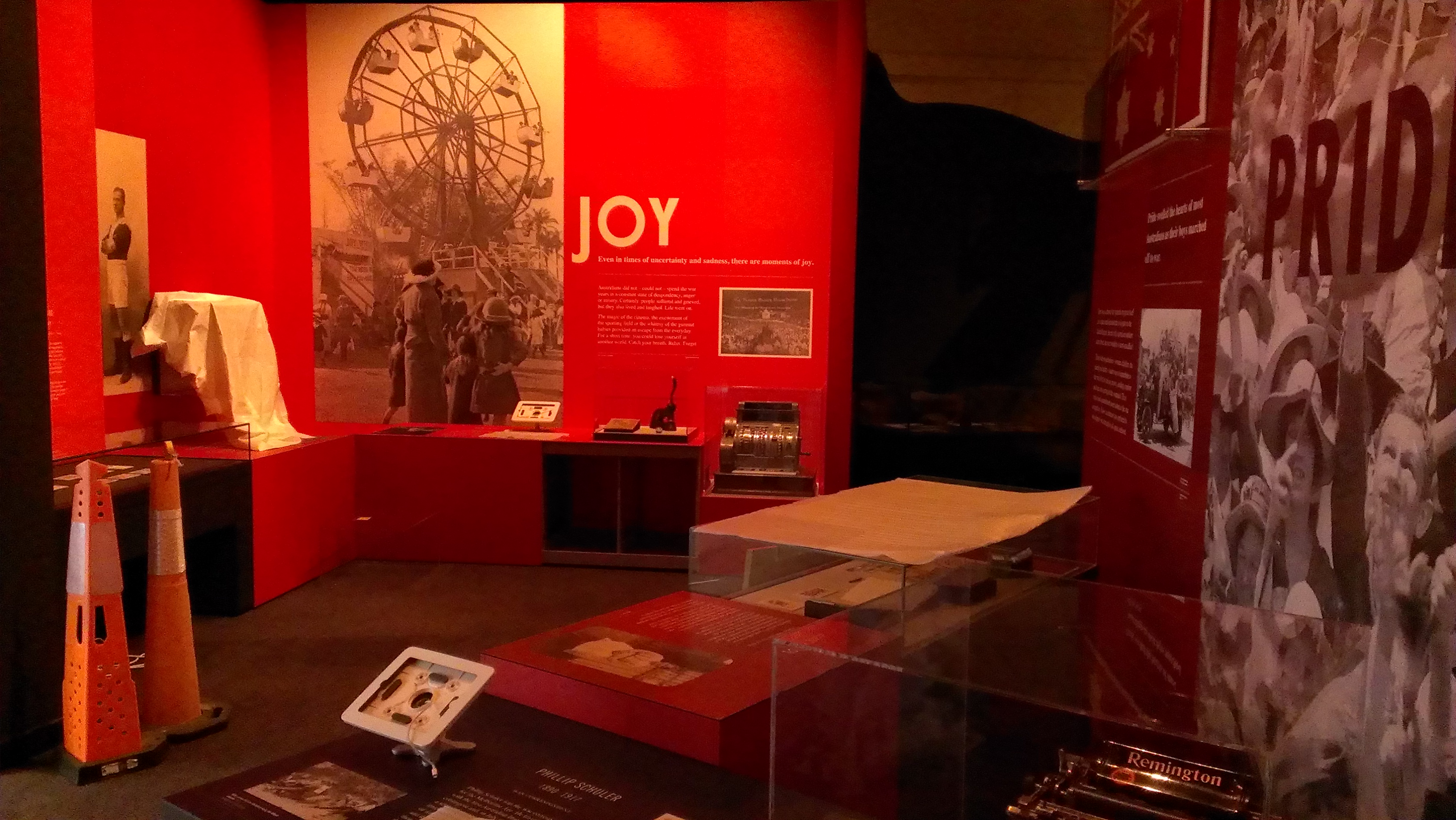 Well the install is complete and the new Homefront show is just about ready to open. One last clean of the glass cases and vitrines and we’ll be set for the exhibition launch tomorrow. It’s fascinating to watch the gallery space change from the construction site it was a few weeks ago to the sparkling and colorful space that it is today. Two weeks ago the last exhibition, Spirited was de-installed and all that was left was a cavernous skeleton of a room. The building crews came in and installed the temporary walls as per the design and then the paint crews took over.