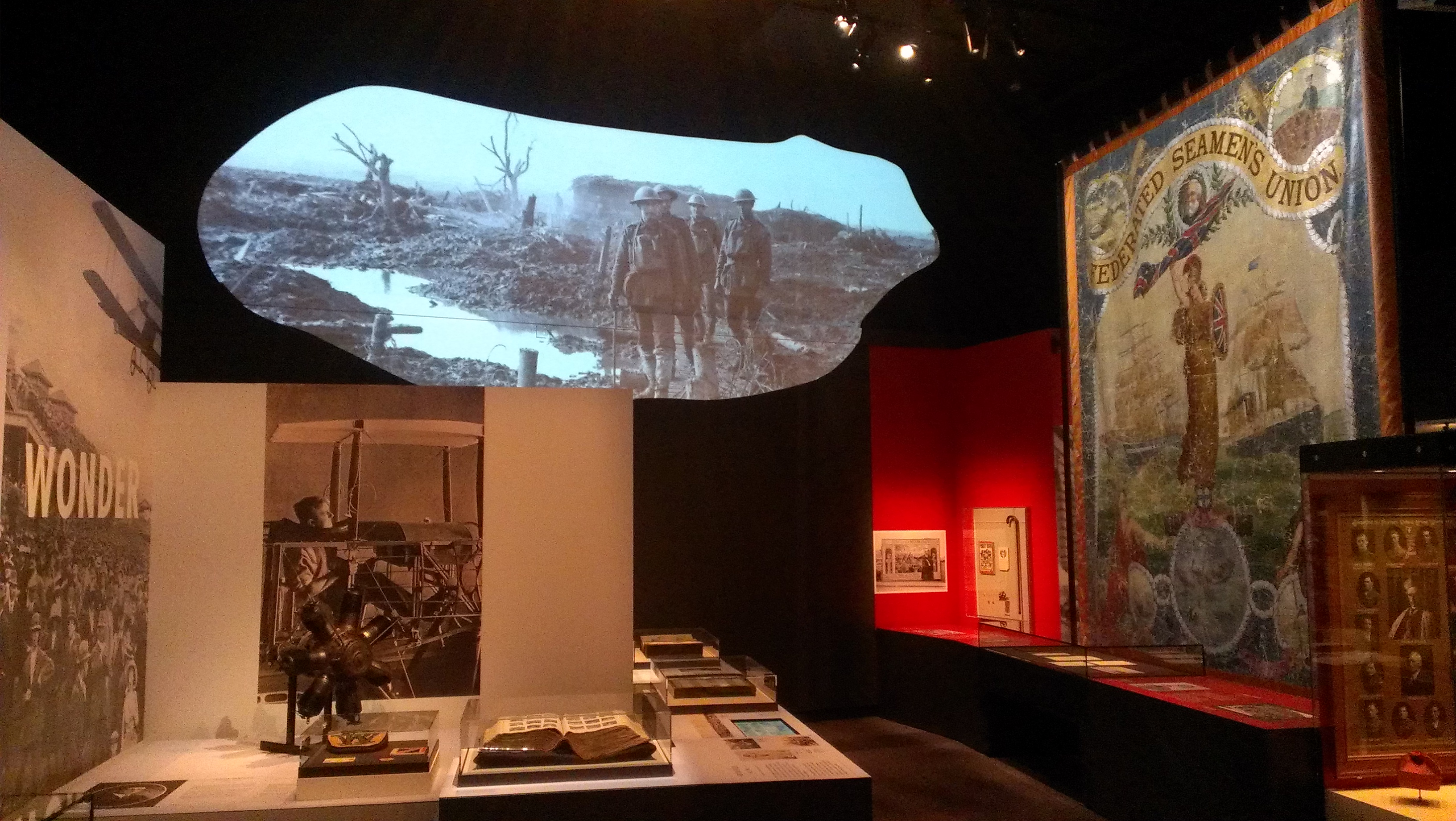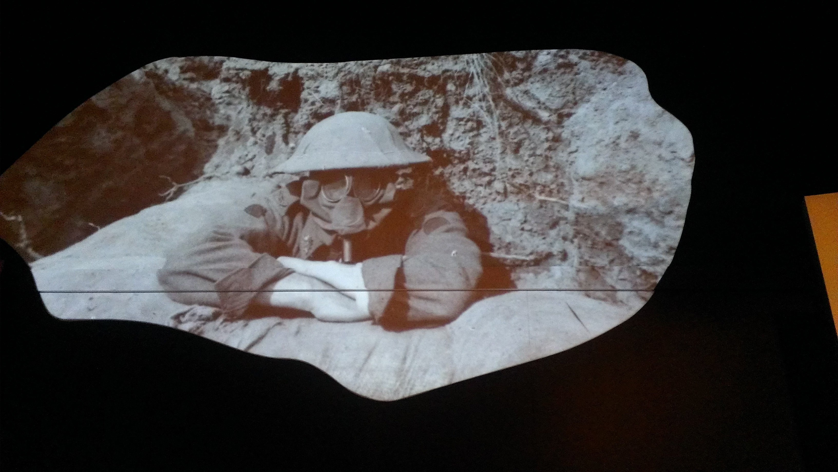There are a few elements I want to point out that I think work really well in the space. First are the projections, such as the one above, that you see in the opening shot of this post. They appear high up on two of the walls and work fantastically well to give a sense of space and depth in the gallery while at the same time, because they are a constant roll of battle scenes, provide a reminder of the war that formed the background of all home front activities in Australia over the 1914-1918 period.